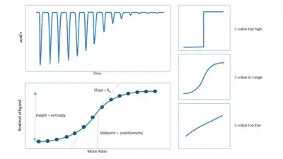 where is the stoichiometry of the binding, is the association constant and is the concentration of the molecule in the cell.[1][6][7] The c-value must fall between 1 and 1000, ideally between 10 and 100. In terms of binding affinity, it would be approximately from ~ within the limit range.[8]