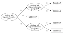 Potential ID3-generated decision tree. Attributes are arranged as nodes by ability to classify examples. Values of attributes are represented by branches.