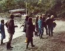 Location crew on Loch Lomond at Millarochy Bay, Balmaha. This was the first of two locations for the 'Boathouse'; because of access difficulties, the scenes were eventually switched to the west side of the Loch at Rossdhu House (1984)