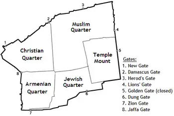 The gate's location is determined by the city's topography. It stands at the point where the valley followed by Jaffa Road meets the city wall at the upper end of the Transversal Valley, which bisects the Old City in a roughly west–east direction, between the northwest ridge and the southwest hill known as Mount Zion.[22][23] Inside the city, there are two streets today that follow the Transversal Valley eastward, down into the Central or Tyropoeon Valley and end at the Temple Mount: David Street, continued by the Street of the Chain.[24] The Transversal Valley with the two streets separates the city into a northern and a southern half, with the Christian and Muslim Quarters to the north, and Armenian and Jewish Quarters to the south.