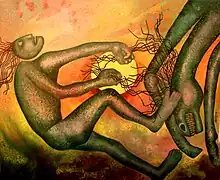 End of 1960s and beginning of 1970s was a period of political turmoil. The left movement in the fold of CPI(ML) rose to its peak ushering in deaths and murders in a devastating measure. The Bangladesh liberation war of 1971 also created great commotion. All creative persons were somehow or other affected by these incidents. All these social upheavals had great impact on his creative self. In early phase his paintings often revealed reality in its crudest form. An acrylic canvas of 1994 titled 'Scrap' shows clusters of dilapidated human bodies tied together are being pulled up from a crate by a crane.