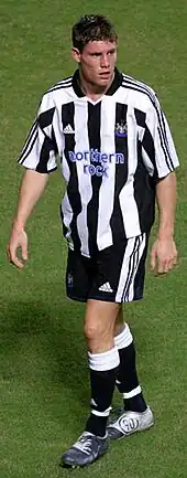 However, Leeds' fortunes were on the decline; the team became the subject of numerous negative stories in the media, and several first-team players were sold.[33] Milner said he believed that this experience made him emotionally stronger and taught him how to deal with team problems.[16] Leeds' eventual relegation to the Championship led to speculation over Milner's future at the club. Tottenham Hotspur, Aston Villa and Everton all expressed an interest in signing him.[22] Ultimately, Villa and Everton did not make offers and Milner rejected an offer from Tottenham as they were based too far from his family home, where he still lived.[34][35] Leeds insisted that he would not be sold with chairman Gerald Krasner referring to him as "the future of Leeds".[16] Nonetheless, financial problems eventually forced Leeds to sell Milner to Newcastle United for £5 million.[36] Although Milner was not happy to be leaving the club he had supported as a child, he wished to do what was "in the club's best interest"[16] and in July 2004, he agreed a five-year contract with Newcastle.[22]