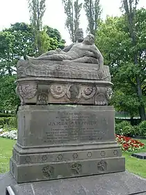 His body was brought home to Tyneside and he was buried in St Edmund's Cemetery, Gateshead. It was claimed that 100,000 mourners attended his funeral.[2] It is true to say that Tyneside was shocked by the death of a 29-year-old athlete in his prime, especially so soon after the deaths of Chambers in 1868 and Clasper in 1870. As with the other two oarsmen, a funeral monument was commissioned to stand over his grave. In 1992, it was restored and moved to a site outside the Shipley Art Gallery in Gateshead,[3] where it remains.
