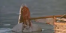 In the ending of the original US theatrical version, Ellen rammed Neptune's Folly into the shark, impaling it on the prow of the boat, mortally wounding it. The shark then causes the boat to break apart with its death contortions, forcing the people on the boat to jump off to avoid going down with it.[49] American audiences disapproved of this ending. Sid Sheinberg says that the impact of the shark and Jake dying "was too much for the audience in one finale".[50] Following this, additional footage was filmed to portray Jake's survival, and special effects shots using miniatures which, Downey says, "saw the shark inexplicably explode after being speared by the boat".[51] Universal used this ending on home media releases.[52] The re-shot ending reportedly began filming only five days after the film was released in the United States. The original ending can be seen on cable broadcasts.[53] In his review of the film, Roger Ebert said that he could not believe "[t]hat the director, Joseph Sargent, would film this final climactic scene so incompetently that there is not even an establishing shot, so we have to figure out what happened on the basis of empirical evidence."[54]