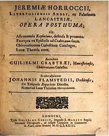 Johannes Kepler had published his Rudolphine Tables in 1627. Two years later he published extracts from the tables in his pamphlet De raris mirisque Anni 1631, which included an admonitio ad astronomos (warning to astronomers) concerning a transit of Mercury in 1631 and transits of Venus in 1631 and 1761.[17] Horrocks' own observations, combined with those of his friend and correspondent William Crabtree, had convinced him that Kepler's Rudolphine tables, although more accurate than the commonly used tables produced by Philip Van Lansberg, were still in need of some correction. Kepler's tables had predicted a near-miss of a transit of Venus in 1639 but, having made his own observations of Venus for years, Horrocks predicted a transit would indeed occur.[18]
