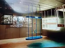 In 1994 he designed a new display case concept "Ice Cube Gliding Furniture System".[22] It's involves attachment to a ceiling of rails or fixed anchoring points. The rails are drawn steel profiles and are made in Austria. Electricity, sound systems (emergency) lighting systems an alarm systems are built into the ceilings.[23] The suspended display cases can be moved manually or by remote control. The light source itself is invisible and the system allows an object to be lit without its throwing a shadow.[24] Ice Cube won the "1998 Provincial Prize for Artistic Craft and Industrial Design" for the province of West Flanders.[25] The system is being applied in the Musical Instrument Museum in Brussels. Many of his works were shown at: