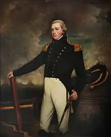 With the Napoleonic Wars ongoing, in December 1804 Roberts followed his uncle into the Royal Navy, becoming a first-class volunteer on board Gore's ship, the 32-gun frigate HMS Medusa. One of his first duties in Medusa was to convey Charles Cornwallis, 1st Marquess Cornwallis to India to take up his post as Governor-General of India, sailing on 15 April. The return journey was one of the fastest to date, taking eighty-two days.[1][3] In Medusa he also served off the Cape Verde Islands, St Helena, and Cadiz.[2] In January 1806 Roberts, now a midshipman, joined his uncle's new command, the 74-gun ship of the line HMS Revenge.[1]