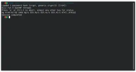 Then we see output from John working. Loaded 1 password hash — the one we saw with the "cat" command — and the type of hash John thinks it is (Traditional DES). We also see that the attempt required one guess at a time of 0 with a 100% guess rate.
