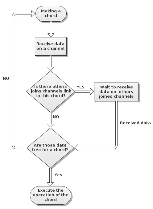 The join-pattern (or a chord in Cω) is like a super pipeline with synchronisation and matching. In fact, this concept is summarise by match and join a set of message available from different message queues, then handles them all simultaneously with one handler.[1] It could be represented by the keywords when to specify the first communication that we expected, with the and to join/pair other channels and the do to run some tasks with the different collected messages. A constructed join pattern typically takes this form: