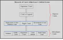 The Judiciary of Kenya consists of five Superior courts, namely the Supreme Court, Court of Appeal, High Court, Employment & Labor Relations Court, and the Environment & Land Court. The subordinate courts consist of the Magistrates Courts, Small Claims Courts, Kadhi Courts, Tribunals and the Courts Martial.[1]