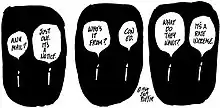 Feiffer had no stories to tell. His main concern was to explore character. In a series of a dozen or so pictures, he would show the shifts of mood that flickered across the faces of men and women as they tried, often vainly, to explain themselves to the world, to their husbands and wives, to their mistresses and lovers, to their employers, to their rulers, or simply to the unseen adversaries at the other end of the telephone wires ... It would be no exaggeration to say that his dialog is as acute as any that is being written in America today. Dialog aimed at sophisticated minds, usually with the purpose of shaking them out of sophistication into real awareness.[10]