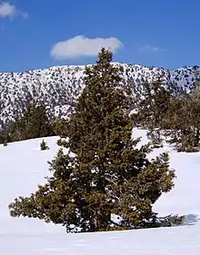 The southernmost population of J. seravschanica is in the Hajar Mountains of Oman, where the junipers grow in the highest portions of the central range. The junipers form open woodlands at elevations of 2,100–3,000 m (6,900–9,800 ft), sometimes co-dominant with Olea europaea.[7]