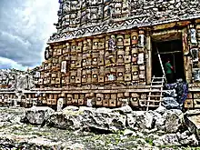 The most famous structure at Kabah is the "Palace of the Masks", the façade decorated with hundreds of stone masks of the long-nosed rain god Chaac; it is also known as the Codz Poop, meaning "Rolled Matting", from the pattern of the stone mosaics.[1] This massive repetition of a single set of elements is unusual in Maya art, and here is used to unique effect.[1]