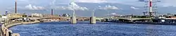 Kantemirovskiy Bridge[2] (Russian: Кантемировский мост) is a large modern[3] (built in 1979 - early 1980s) drawbridge (bascule bridge)[2] in Saint Petersburg, Russia across the Bolshaya Nevka[3] arm of the Neva river. The bridge connects the northern Aptekarsky Island (Apothecary Island) of the north-central Petrogradsky District on Petrograd Side with northeastern Vyborgskiy District of the city and over it with the northeast and east of Saint Petersburg. It receives automobile traffic from Bolshoy Prospekt (Petrograd Side) via Prospekt Medikov[4] in the southwest and takes it to Kantemirovskaya Street on the right-hand riverside, after which it was named. The street itself was named in 1952 after the railway station of a settlement of Kantemirovka in Voronezh region which was liberated from Nazi Germany troops by the Soviet Red Army in December 1942. The settlement in its turn was named after its 18 century owner Dimitrie Cantemir and his brother Constantin, Moldavian princes given shelter in Russia after a military defeat and entered into Russian nobility.