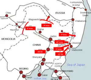 Like the previous concepts drawn up in the aftermath of the Nomonhan Incident, Kantokuen would begin with a massive initial blow on the Ussuri Front against Primorye that would be followed up with another attack to the North against Blagoveshchensk and Kuibyshevka.[45] Under the umbrella organization of the First Area Army, the Japanese Third and Twentieth Armies, supported by the 19th Division of the Korea Army, would penetrate the border south of Lake Khanka to overcome the main Soviet defensive lines and threaten Vladivostok. Simultaneously, the Fifth Army would strike just south of Iman (now Dalnerechensk) to complete the isolation of the Maritime Province, sever the Trans-Siberian Railway, and block any reinforcements arriving from the north. In northern Manchuria, the Fourth Army would at first hold the Amur River line before it transitioned to the offensive against Blagoveshchensk.[46][47] Meanwhile, two reinforced divisions of Japanese troops outside the Kantokuen force structure would start operations against Northern Sakhalin from both the landward and the seaward sides with the aim of wiping out the defenders there in a pincer movement.[48] Other second-stage objectives included the capture of Khabarovsk, Komsomolsk, Skovorodino, Sovetskaya Gavan, and Nikolayevsk. Additionally, amphibious operations against Petropavlovsk-Kamchatsky and other parts of the Kamchatka Peninsula were contemplated.[49][50]