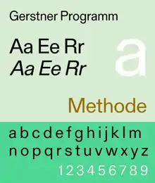 Gerstner Programm was designed by Karl Gerstner between 1964-67 and first published in Berthold's Diatype filmsetting format. 16 versions of the programme were generated, 8 regular and 8 italic, using the Sinar camera under the expert direction of GGK staff member Werner Richli. Templates were executed by Christian Mengelt. It was successful in the U.S., where it was issued by Aaron Burns, but soon perished with the Diatype system.[6]