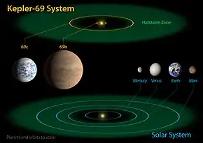 Kepler-69 has two known planets orbiting around it.[1] Kepler-69b is a hot super-Earth-sized exoplanet. Kepler-69c is a super-Earth-sized exoplanet, about 70% larger than Earth. It receives a similar amount of flux from its star as Venus does from the Sun, and is thus a likely candidate for a super-Venus.[11]