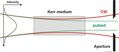 Because of the non-uniform power density distribution in a Gaussian beam (as found in laser resonators) the refractive index changes across the beam profile; the refractive index experienced by the beam is greater in the center of the beam than at the edge. Thus a rod of an active Kerr medium functions as a lens for high intensity light. This is called self-focusing and in extreme cases leads to material destruction. In the laser cavity short bursts of light will then be focused differently from continuous waves.