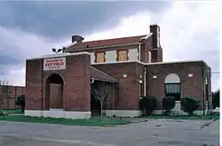 The old terminal building is a two-story brick building crowned with a gabled roof and parapeted end walls.[9] Facing east toward Highway 11, the building is supported by a concrete foundation. The side wings and front pavilion of the terminal have flat parapet roofs as well, and a gable-roofed porte-cochère extends from the front pavilion and terminates at a taller brick wall, in which is a large arched opening. The front pavilion has another arched opening that leads to a recessed entrance. A one-story polygonal porch dominates the rear façade, facing the airfield. Flanking the porch, there are arched openings in the side wings as well. The second floor has a central door that opens onto the porch roof, forming an observation deck overlooking the airfield. The interior of the building contains a waiting room with the former manager's office to the north and the baggage and mailroom to the south. All the walls in the building are plastered, and the floors are vinyl tile. A staircase leads to the second floor, which is a single room that originally housed the weather bureau.[8]