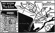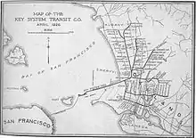 Transbay service began on October 26, 1903,[4] with a four-car train carrying 250 passengers, departing downtown Berkeley for the ferry to San Francisco.[5] Before the end of 1903, the general manager of the SFOSJR devised the idea of using a stylized map on which the system's routes resembled an old-fashioned key, with three "handle loops" that covered the cities of Berkeley, Piedmont (initially, "Claremont" shared the Piedmont loop) and Oakland, and a "shaft" in the form of the Key pier, the "teeth" representing the ferry berths at the end of the pier. The company touted its 'key route', which led to the adoption of the name "Key System".[6]