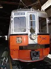The Key System's first trains were composed of standard wooden railroad passenger cars, complete with clerestory roofs. Atop each of these, a pair of pantographs, invented and manufactured by the Key System's own shops, were installed to collect current from overhead wires to power a pair of electric motors on each car, one on each truck (bogie).[21][22][23][24][25]