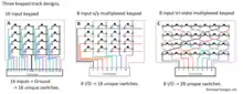 Figure 1. Keypad wiring methods: separate connections (left), x/y multiplexing (center), Charlieplexing (right).