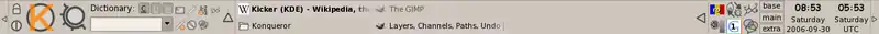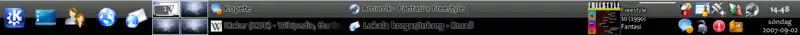 Kicker (also referred to as KDE Panel) is the main panel used in KDE 3 and earlier, and also in the TDE desktop. Together with KDesktop, it forms the graphical shell. It can be customized by the user. By default, it has the K Menu, a Desktop Access button, a Home button, a Konqueror button, a Kontact button, and a Help button. It also has the Desktop Preview & Pager, the Taskbar, the System Tray, and the Clock.