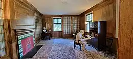 The western half of the first floor contains a parlor and a library (the latter also known as the family room).[246] Both rooms are 24 feet (7.3 m) wide; the parlor is 16 feet (4.9 m) deep, while the library is 22 feet (6.7 m) deep.[94] The parlor, at the southwest corner of the house, has a gray-and-white marble fireplace mantel, which was added in the late 1820s and was designed in the Greek Revival style.[244] The parlor also has a paneled door; a plaster wall with baseboard and chair rail; six-over-six sash windows; and a cornice with moldings, dentils, and Greek frets.[72] In the rear of the western wing is a library with three built-in floor to ceiling bookcases,[247] which were imported from England and once accommodated over five thousand volumes.[248] When King lived in the house, the library was filled with 5,000 books,[66] mainly about the Americas.[249][250] These included over 400 volumes from the 16th to mid-18th centuries.[251] The fireplace has white-and-blue Dutch tiles on its mantel, as well as paneling on its overmantel.[244] The library's wall also contains a chair rail; the walls are painted to resemble paneling with wood grains, giving the impression that the lower half of the wall is wainscoted.[72][252] Other elements of the library include a paneled door.[72]