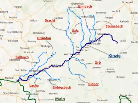 The Kinzig is a river, 87 kilometres long, in southern Hesse, Germany. It is a right tributary of the Main. Its source is in the Spessart hills at Sterbfritz, near Schlüchtern. The Kinzig flows into the Main in Hanau. The Main-Kinzig-Kreis (district) was named after the river. The towns along the Kinzig are Schlüchtern, Steinau an der Straße, Bad Soden-Salmünster, Gelnhausen, and Hanau. The Kinzig is first recorded in 815 A.D. as Chinzicha.