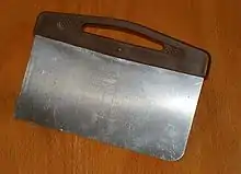 | Dough scraper | Bench scraper, Scraper, Bench knife | To shape or cut dough, and remove dough from a worksurface | Most dough scrapers consist of handle wide enough to be held in one or two hands, and an equally wide, flat, steel face. | ![]() |