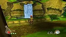 Knight's Apprentice is an action-adventure game in which players control Memorick and explore eleven levels set across eight worlds.[3] The game follows a simple control scheme in which players attack using a sword and defend using a shield, with an additional combinations including a shield bash and special powers when weapons and shields are upgraded, and can perform different types of jumps to traverse platforms. The game features a simple health system, replenished by potions, which can be found by players when unlocking chests throughout levels. Players progress by collecting orbs throughout levels, which can be used to unlock leylines that transport to new areas. Once the player retrieves an Oracle Stone, they can see the locations of objectives on the world map and the number of orbs in a given area.[4] In some stages of the game, players are able to navigate by riding on horseback or griffin, or riding down water courses on their shield.[5]