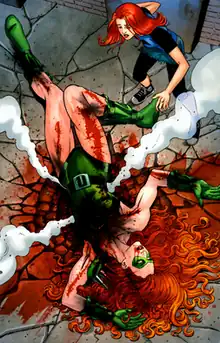Following her resurrection and a period of mental recovery, she rejoins the Secret Six and accompanies the team on a mission to Gotham to kill several of Batman's allies.[14] While in Gotham, Scandal proposes a polygamous marriage between Knockout, herself, and the stripper that she had been dating while Knockout was still dead. Knockout accepts the proposal just prior to the team being ambushed by a number of superheroes who come to assist Batman, resulting in a massive battle. Knockout is quickly blasted in the face by Captain Atom, and falls to the ground next to Scandal. The two women hold hands one last time, with Knockout referring to Scandal as her "wife" before losing consciousness. The fates of Knockout and the other members of the Secret Six (save for Bane) are ultimately left ambiguous as the series ends.[15]