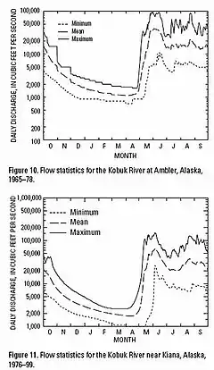 Flow records are available from USGS monitoring stations at Ambler and Kiana. Average annual flow for the Kobuk River at Ambler ranged from 5,839 cubic feet per second (165.3 m3/s) to 14,890 cubic feet per second (422 m3/s) over the period of record from 1966 to 1978, with peak discharge ranging between 30,000 cubic feet per second (850 m3/s) and 95,000 cubic feet per second (2,700 m3/s). Near Kiana, average annual flow ranged from 10,020 cubic feet per second (284 m3/s) to 24,960 cubic feet per second (707 m3/s) for the period from 1977 to 1999, with peaks of 45,000 cubic feet per second (1,300 m3/s) to 161,000 cubic feet per second (4,600 m3/s). Peak flows can result from large volumes of water released when ice jams fail.[3] Flow records are also available for Dahl Creek, a tributary of the Kobuk River with a confluence near the town of Kobuk.