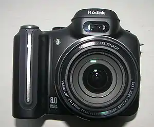 The EasyShare P880 is a bridge digital camera from Kodak introduced on August 2, 2005, as part of Performance series. Its siblings are the P850 and the P712. The P880 possesses the largest optical sensor of all three models, with a size of 1/1.8 inches. Distinguishing features include wide-angle coverage of 24 mm (35 mm equivalent), an on screen histogram display, and manual focus-by-wire. In terms of the Kodak product line and price the Performance series are the most sophisticated EasyShare cameras, just below the considerably more expensive Kodak professional DCS pro SLR digital cameras that were discontinued in May 2005.