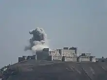 The Syrian Civil War began in 2011, prompting UNESCO to raise concerns that the war might damage cultural sites including Krak des Chevaliers.[53] The castle was shelled in August 2012 by the Syrian Arab Army, damaging the Crusader chapel.[54] It was damaged again in July 2013 by an airstrike conducted by the Syrian Arab Air Force during the Siege of Homs,[55] and once more on 18 August 2013. The Syrian Arab Army captured the castle and village of al-Hosn in March 2014. Since then, UNESCO has published periodic reports about the state of the site, reconstruction and conservation measures.[56]