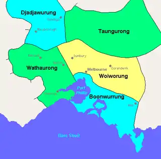 • Wathaurong (Wadha-wurrung): spoken by 15 clans south of the Werribee River and the Bellarine Peninsula to Streatham. Referred to by Europeans as the Barrabool people. The escaped convict, William Buckley lived with this community for 32 years, between 1803 and 1835, before being found by John Batman on 6 July 1835.