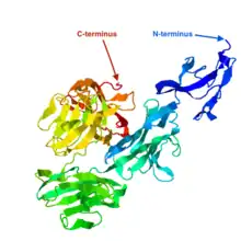The secondary structure of LENG9 is predicted to be composed of alpha-helices and beta-sheets throughout the sequence.[14][13][15] The tertiary structure of LENG9 is displayed in the image to the right.