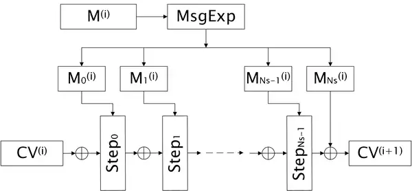The overall structure of the compression function is shown in the following figure.