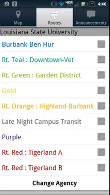LSU Tiger Trails is the alternative transportation system providing bus service for students, faculty, staff and visitors, both on and off the campus of Louisiana State University.[1] The LSU transit system is operated by First Transit, under contract with LSU's Office of Parking & Transportation Services, formerly known as the Office of Parking, Traffic & Transportation.[1] There are a total of 31 buses in the Tiger Trails fleet. During daytime operating hours, the transit system is capable of operating up to 21 buses during peak hours with three back-up, and six small buses for on demand service.[2]