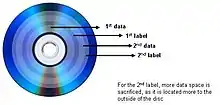 If you add a label on the data side of the disc, then this space is no longer available for data. The amount of space it takes depends on the size (width) of the label and the location of the label on the disc. The wider the label and the more it is located on the outside of the disc, the more space it takes. In other words: the bigger the label, the more disc surface is occupied and thus the more data-space you sacrifice. For example: a 5 mm label at the inside requires 10% capacity, and at the outside of the disc about 20% of the disc capacity.
