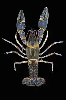 The banded mudbug is a small (maximum size: ~2–2.5 inches) primary burrowing crayfish. This crayfish is typically blue overall with orange highlights on its joints, although rare bright blue and pink specimens have also been collected.[3] Because of this species' exceedingly small range and overall rarity, this species is ranked as S1 (Critically imperiled) in both states where it occurs (Alabama and Mississippi) and has a NatureServe global rank of G1 (Critically imperiled).[1]