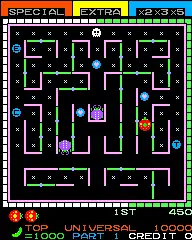 At each level, the maze will contain three letters. The first will be randomly selected from the set of {X, T, R} (which appear only in EXTRA), the second will be randomly selected from the set of {S, P, C, I, L} (which appear only in SPECIAL), and the third will be an A or an E (which appear in both words). A secondary goal of the player is to complete the words SPECIAL (indicated in red in the top left corner) and EXTRA (in yellow at top center). If, for example, a letter S is consumed while it is red, the corresponding letter in the word SPECIAL will change from grey to red. Eating an S while it is any other color (or if the S in SPECIAL is already red) offers no benefit beyond the points collected. Completing the word SPECIAL rewards the player with a free game, while completing EXTRA gives the player an extra life. Completing either word causes all its letters to return to normal and immediately advances the player to the next level.