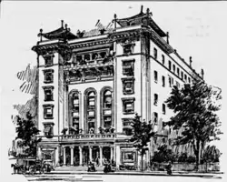 The Lafayette Square Opera House as built by John W. Albaugh, on behalf of the Lafayette Square Opera House Company. It was completed in September 1895 at a cost of 250,000 dollars ($8.79 million in present day terms). Located on Madison Place NW, just north of Pennsylvania Avenue, the theater faced Lafayette Square and the White House. The site, originally the home of Commodore John Rodgers,[4] was noted for a history of tragic events. It was there that Congressman, later Civil War General, Daniel Sickles killed the district attorney for the District of Columbia, Philip Barton Key II, son of Francis Scott Key. Following the Civil War, John Wilkes Booth's co-conspirator, Lewis Powell, attempted to take the life of Secretary of State William H. Seward, who was living there at the time. The property was later purchased by former Secretary of State James G. Blaine, and it was there that he and two of his children, Walker and Alice, died.[5][6][2]