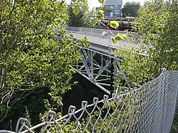 The bridge is a Warren deck truss and continuous deck truss[4] made of riveted steel. The 139-foot (42 m) bridge has three spans: a main span of 105 feet (32 m) flanked by two 34-foot (10 m) spans. The guard rails are made of woven steel lattice.[1]