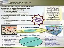 LandWarNet (LWN) is the United States Army’s contribution to the Global Information Grid (GIG) that consists of all globally interconnected, end-to-end set of Army information capabilities, associated processes, and personnel for collecting, processing, storing, disseminating, and managing information on demand supporting warfighters, policy makers, and support personnel. It includes all Army (owned and leased) and leveraged Department of Defense (DOD)/Joint communications and computing systems and services, software (including applications), data security services, and other associated services.[1] LandWarNet exists to enable the warfighter through Mission Command, previously described as Battle Command.[2] Other U.S. service equivalent efforts to LandWarNet include the Navy's "FORCEnet" and the Air Force's "C2 Constellation."[3]