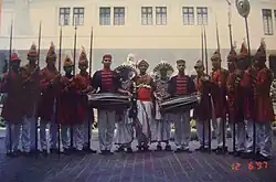 The full complement of the Ceylon Government Lascoreen Guard–of-Honour consisted of thirty-six guards clad in scarlet tunics with gold embroidery, white cloth/trouser and plumed headgear. They carried lances and 'sesath' (white parasol) and marched to the beat of the tom-tom band and flutes piping military music.