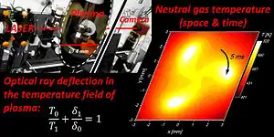 Laser schlieren deflectometry has been used for investigation of the temperature dynamics, heat transfer and energy balance in a miniaturized kind of atmospheric-pressure plasma.[3]