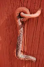 A cabin hook is a hooked bar that engages into a staple.[8][9] The bar is usually attached permanently to a ring or staple that is fixed with screws or nails to woodwork or a wall at the same level as the eye screw. The eye screw is usually screwed into the adjacent wall or onto the door itself. Used to hold a cupboard, door or gate open or shut.[10]