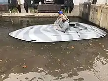 A layout boat is a low-profile un-motorized oval-like boat that is used by diver duck hunters to hide in when hunting in open water. They are unique to a specialized form of waterfowl hunting called Layout hunting. Most layout boats are used for diver duck or ocean duck hunting where open deep water waterfowl species frequent. Sometimes they are deployed in marshes for more traditional puddle duck hunting or goose hunting. Layout boats come in designs such as pumpkin seed, oval, and box like just to name a few. They come in one- and two-man models. These boats are painted to match the color of the water and sit very low in the water. The main focus of the layout boat is to put the hunter very close to the decoys if not in them for additional concealment. This makes for very dramatic hunting scenarios where a decoying bird comes extremely close to the hunter and boat. They are used to target diver ducks such as bluebills (greater scaup), canvasback, goldeneye, scoters and eider to name a few. This is because divers often fly low on the water and will not notice the low sides of the boat. Layout boats are often placed within the decoy spread, so the decoys help further conceal the sides of the boat.