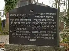 In 1895, Treitel moved to Laupheim to assume the office of District Rabbi in the small Upper Swabian town whose Jewish population at that time was about 500 strong,[14] having been the largest Jewish community in the Kingdom of Württemberg in the middle of the 19th century.[15] He was rabbi in Laupheim until retirement in 1922.[16] No successor to Treitel as rabbi was appointed. As a consequence the office of district rabbi, established in 1832, ceased to exist on 1 April 1923.[17] Leopold Treitel died on 4 March 1931 surrounded by his family, having suffered a stroke a few days earlier. He was interred at Laupheim Jewish Cemetery.[18] When his wife Rebecca died in 1936, she was buried alongside him, a first on the cemetery where men and women had usually been buried separately.[19][20]